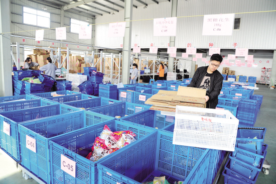 昨天上午,口水娃食品有限公司電商事業(yè)部員工備貨、整理庫房,迎戰(zhàn)“雙十一”。2010年該公司成立電商事業(yè)部,進軍網(wǎng)上銷售,去年實現(xiàn)銷售8000萬元,躋身全國休閑零售銷售前30強,預(yù)計今年網(wǎng)上銷售達1.2億元。 記者 計海新 攝
