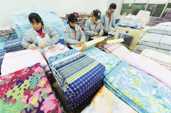 昨天,瑪雅家紡針織有限公司員工在包裝一批新開發(fā)的家紡用品。據(jù)介紹,該公司是一家以瑪雅絨為主要面料生產(chǎn)家紡用品的企業(yè),在激烈的市場競爭中,今年新開發(fā)天絲、薄荷纖維、竹纖維及發(fā)熱纖維等功能性家紡用品,不僅成為地方一大特色品牌,而且被羅萊、夢潔等國內(nèi)一線家紡企業(yè)指定為重點供應(yīng)商。 記者 姚建平 攝