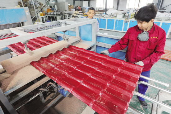 昨天上午,品君新材料科技(蘇州)有限公司生產(chǎn)流水線(xiàn)上,一種新穎的合成樹(shù)脂瓦正在不停地下線(xiàn)。據(jù)介紹,作為新一代環(huán)保產(chǎn)品,合成樹(shù)脂瓦選用法國(guó)獨(dú)特樹(shù)脂精制而成,具有質(zhì)輕、耐腐、防火、隔熱等特點(diǎn),已被廣泛應(yīng)用于各類(lèi)建筑屋面,公司年產(chǎn)量為30萬(wàn)平方米左右,是蘇州市唯一一家生產(chǎn)該產(chǎn)品的企業(yè)。 記者 姚建平 攝