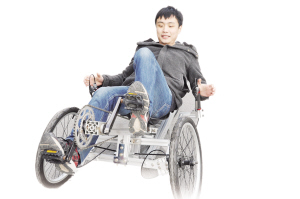 躺車和普通自行車在外觀上有很大不同,躺車比較矮且有3個輪子,普通的座椅被改成了可以斜躺著的座椅,操控車子前進、剎車和方向的車把變成了左右各一個,方便騎行者躺著控制躺車。只見何騫躺倒在車上,腳踩上踏板,左右手握住車把熟練地操控著躺車,非常輕松地在小區(qū)里繞起圈來。