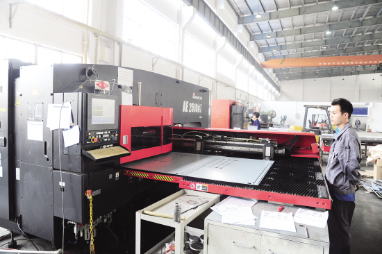 昨天上午,博汭電氣有限公司工人在數(shù)控機(jī)床上沖壓鐵路電氣柜外殼。該公司生產(chǎn)的電氣柜暢銷國(guó)內(nèi)及日本、歐美等地,產(chǎn)品為鐵路、地鐵系統(tǒng)配套,今年產(chǎn)值可超億元。 記者 計(jì)海新 攝