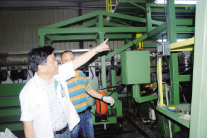 和上料裝置類(lèi)似,蔡建軍他們發(fā)明的另一項(xiàng)設(shè)備也并不復(fù)雜,但又很實(shí)用,這就是地毯驗(yàn)布機(jī)。蔡建軍告訴記者,地毯生產(chǎn)過(guò)程中,可能產(chǎn)生污漬、疵點(diǎn)、油斑等瑕疵,因此要進(jìn)行檢驗(yàn),但以前工人檢驗(yàn)時(shí),都是手動(dòng)拉出一段,查看一段,再卷一段,效率很低,蔡建軍感覺(jué)可以提高此工序的自動(dòng)化程度,但讓拉、卷自動(dòng)化并不難,難的是布“走”得快了以后,如何保證不“放走”,并馬上“抓住”瑕疵。經(jīng)過(guò)反復(fù)實(shí)驗(yàn),最后蔡建軍用比較簡(jiǎn)單的方法解決了問(wèn)題,即加強(qiáng)燈照讓工人能迅速發(fā)現(xiàn)瑕疵,發(fā)現(xiàn)瑕疵后只要一按開(kāi)關(guān)就能停下機(jī)器進(jìn)行處理。