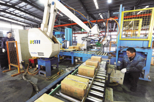 東又悅(蘇州)電子新材料科技有限公司是一家省級高新技術(shù)企業(yè),主要生產(chǎn)陽極磷銅(銅球),產(chǎn)品打入富士康、南亞、健鼎等知名公司。今年,公司投資500多萬元引進(jìn)自動(dòng)化生產(chǎn)包裝線,加快了生產(chǎn)速度,降低了人工成本,預(yù)計(jì)全年可實(shí)現(xiàn)銷售收入5億元。圖為機(jī)器人手臂在包裝產(chǎn)品。