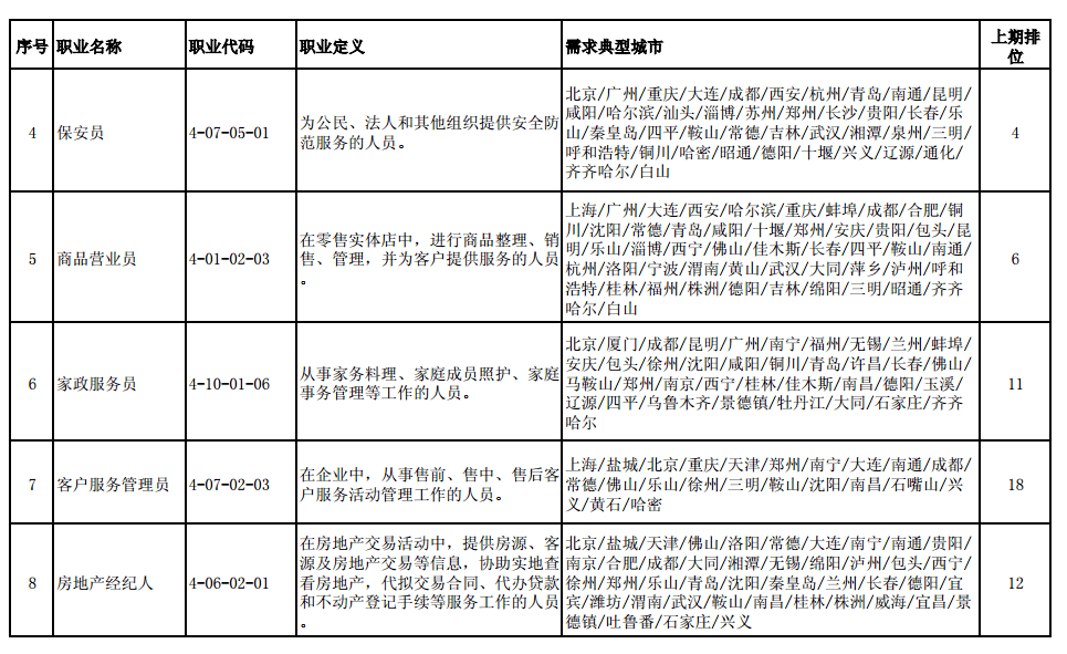 人力資源和社會(huì)保障部10月23日召開新聞發(fā)布會(huì),發(fā)布2020年第三季度全國(guó)招聘大于求職“最缺工”的100個(gè)職業(yè)排行,排名前十的職業(yè)是:營(yíng)銷員、保潔員、餐廳服務(wù)員、保安員、商品營(yíng)業(yè)員、家政服務(wù)員、客戶服務(wù)管理員、房地產(chǎn)經(jīng)紀(jì)人、快遞員、車工。