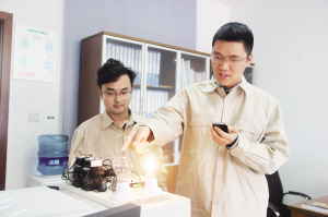 王盛輝(右)演示他研制的變電站遠(yuǎn)動(dòng)設(shè)備遠(yuǎn)程重啟裝備。