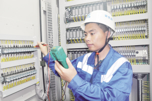 在距離地面50米高的鐵房子里,時而測量配電柜、錯綜復雜線路的電流電壓,時而檢查電動機、各種傳動裝置的運行情況。記者近日來到太倉正和碼頭有限公司采訪,看到安全保障部副經理王永春正在給一臺岸橋檢查“心臟”。