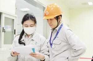 梁馨月(右)在檢查機(jī)組運(yùn)行數(shù)據(jù)。