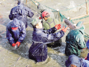 養(yǎng)殖場(chǎng)有了新的大客戶讓吳勇特別高興,完全忘記了捕魚過程的苦和累。捕魚可以說是水產(chǎn)養(yǎng)殖最苦和最累的活,尤其冬天,大家一起站在齊腰深的水塘里用大網(wǎng)拖魚,從魚塘的一端拖到另一端,要幾個(gè)小時(shí),“塘水刺骨,雖然有防水服,但還是感覺直冷到了骨頭里”。