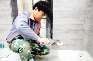 記者見(jiàn)到汪立治時(shí),他正在城東一小區(qū)的一戶聯(lián)排別墅中施工,這套房子的裝修施工已經(jīng)進(jìn)入尾聲,這時(shí)候也是鑲貼施工最煩瑣的時(shí)候,因?yàn)榇竺娣e的地方都貼好了,要貼的都是邊邊角角,很多板材都需要在現(xiàn)場(chǎng)加工。
