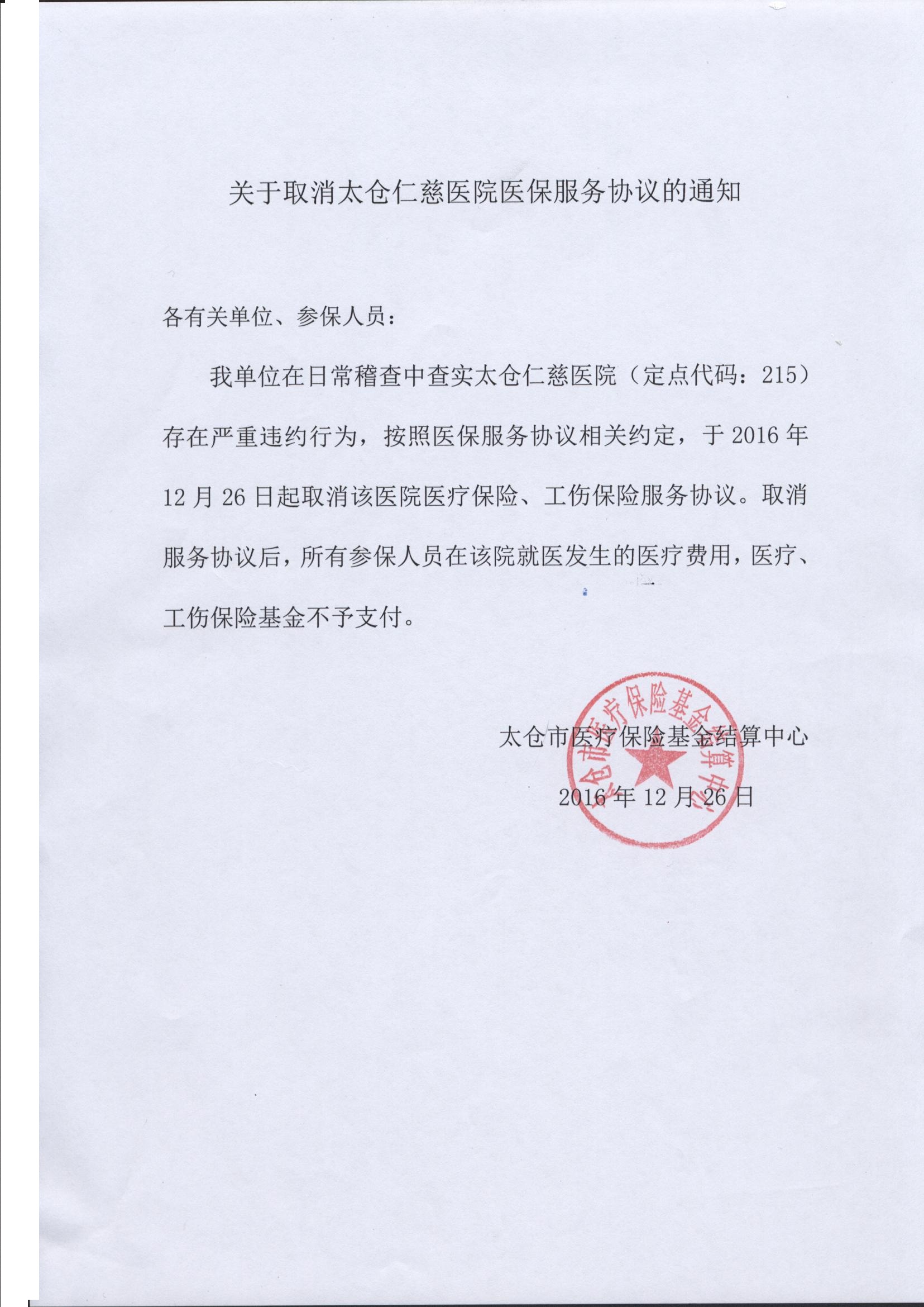 我單位在日?;橹胁閷?shí)太倉(cāng)仁慈醫(yī)院(定點(diǎn)代碼:215)存在嚴(yán)重違約行為,按照醫(yī)保服務(wù)協(xié)議相關(guān)約定,于2016年12月26日起取消該醫(yī)院醫(yī)療保險(xiǎn)、工傷保險(xiǎn)服務(wù)協(xié)議。取消服務(wù)協(xié)議后,所有參保人員在該院就醫(yī)發(fā)生的醫(yī)療費(fèi)用,醫(yī)療、工傷保險(xiǎn)基金不予支付。